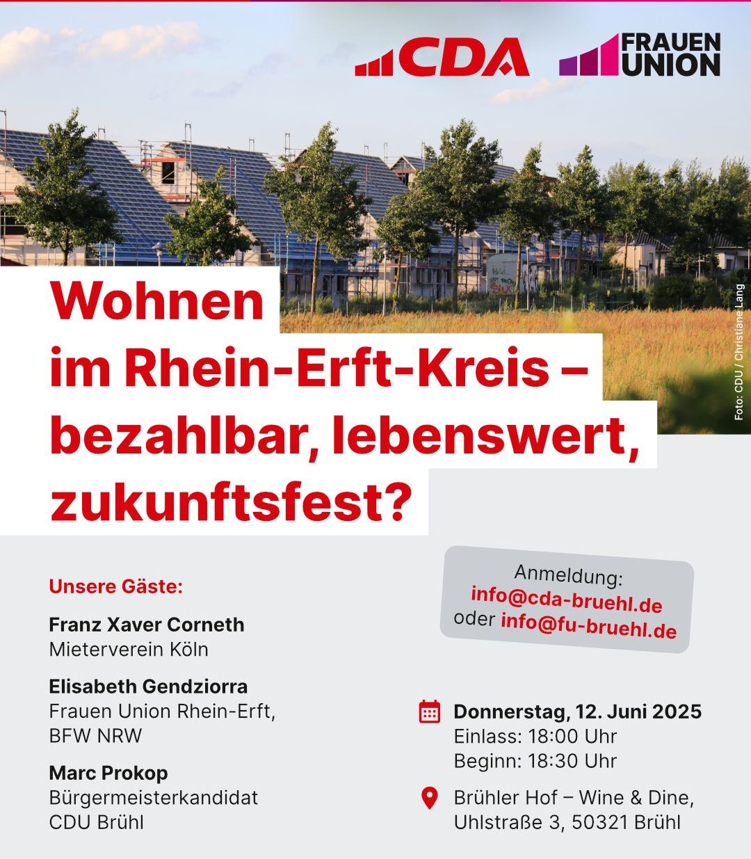 Wohnung verzweifelt gesucht? Warum das immer schwieriger und Wohnen teurer wird, erfahrt Ihr am 12.06.2025 bei einem spannenden Abend von CDA Brühl und